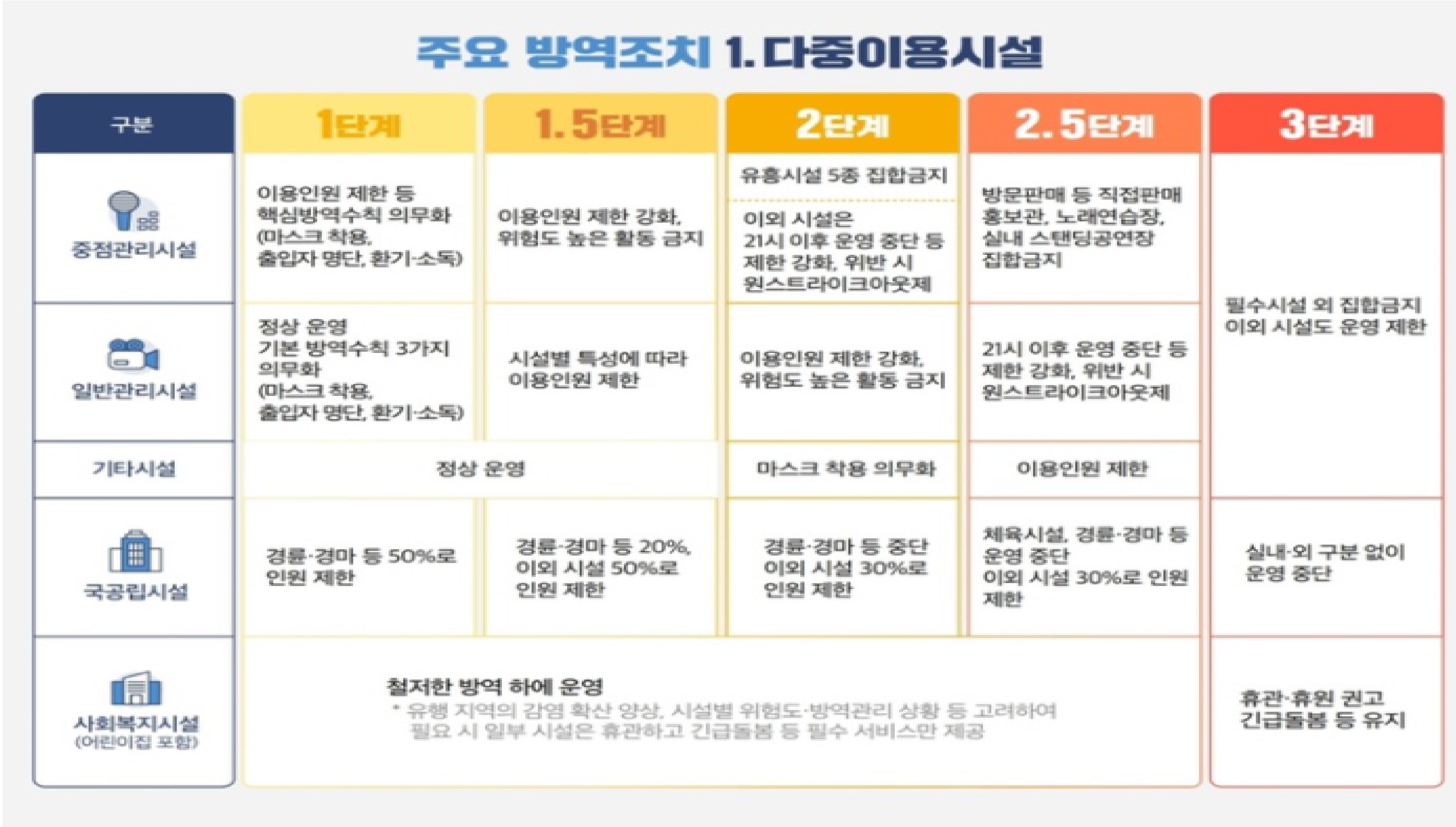 우선 3단계 조치에 들어가게 되면 일반적으로 이용하는 시설들은 집합이 금지되고 있습니다. 3단계시 필수 시설 외에 일반관리 시설 등 집합 금지 명령이 내려지며 그 외 시설 또한 운영이 중지된다고 합니다.