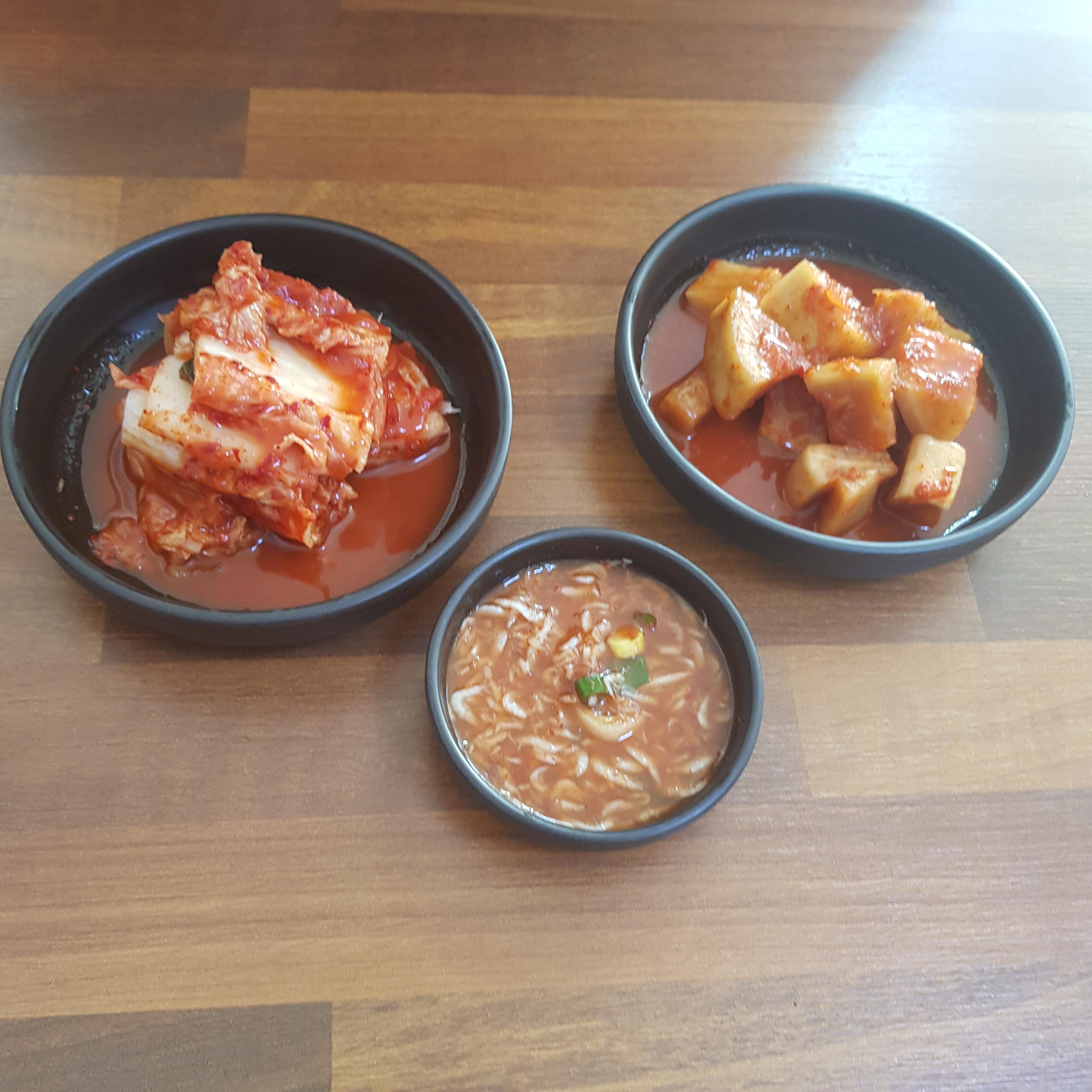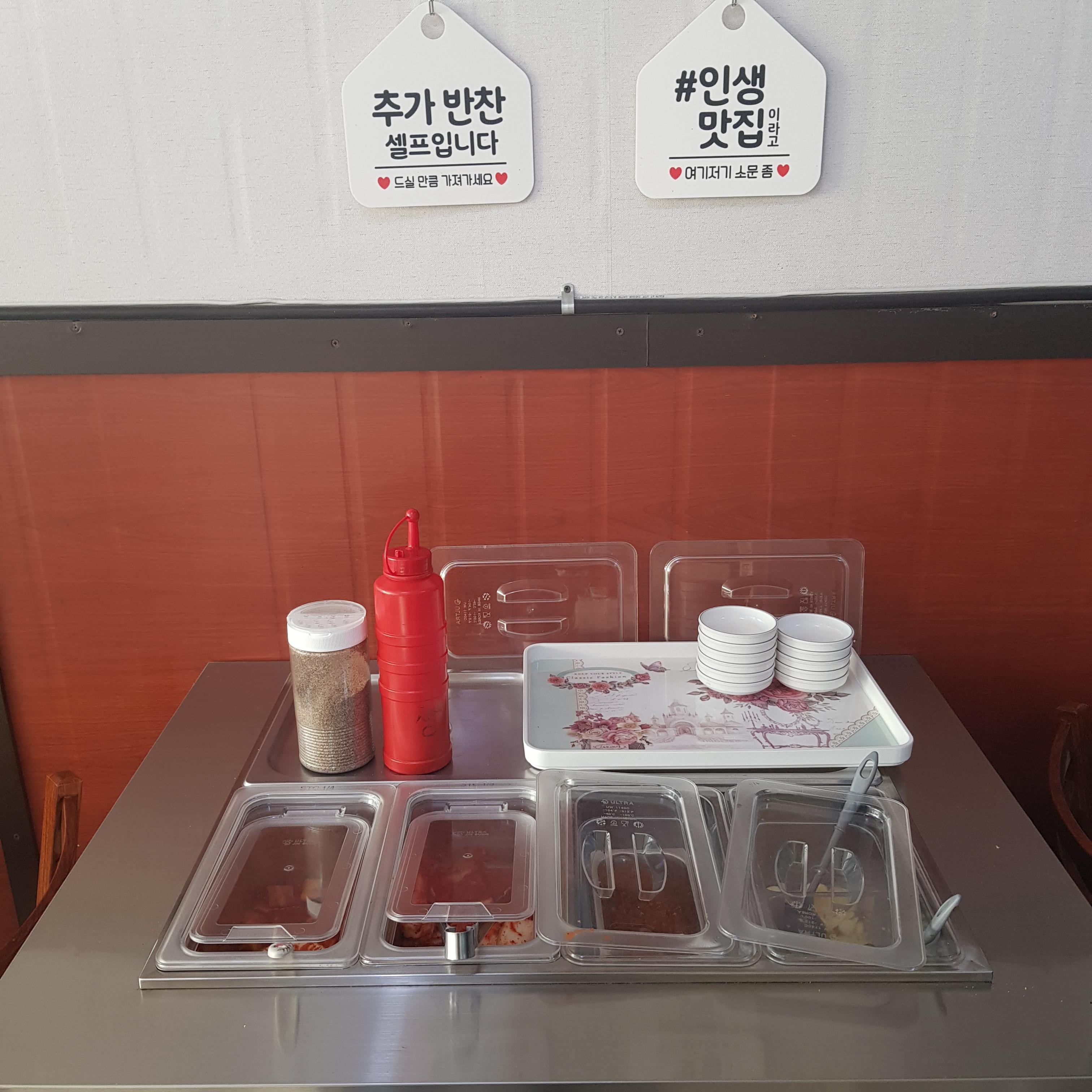 여기 보시면 추가 반찰 셀프 코너입니다. 여기에는 김치, 깍두기, 쌈장, 마늘, 고추, 다진 양념 등등 있어서 부족하시면 가져다가 드시면 됩니다.