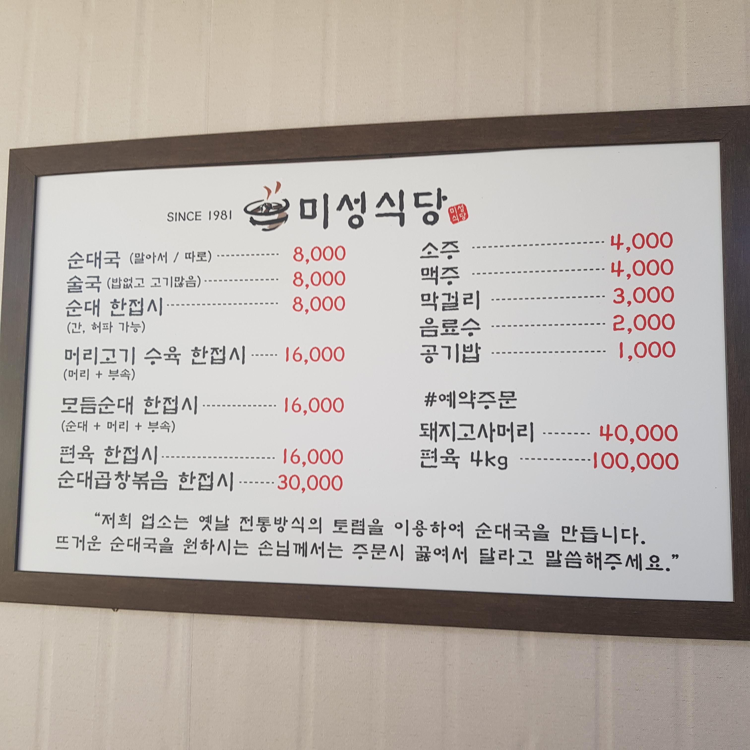 미성 식당에 메뉴판입니다. 여기 오는 단골손님들은 보통 순대국을 많이들 드십니다. 그중에서 순대국 말아서랑 따로 있는데 제가 아는 지인도 그렇고 전부 말아서 순대국을 드십니다. 사람들의 기호에 맞혀서 따로 드셔도 되고 말아서 드셔도 됩니다. 저는 말아서 드시는 거를 추천합니다.