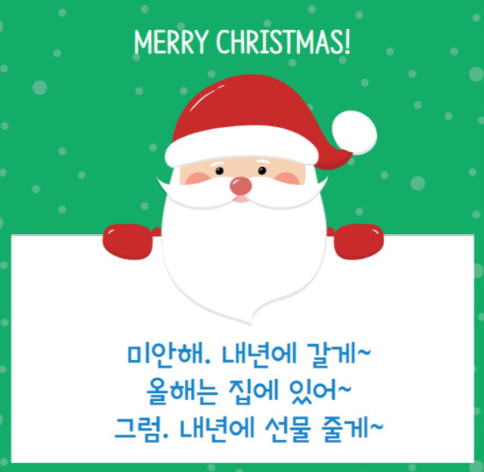 올해 같은 경우에는 코로나 19로 인하여 인사말이 많이 변경되었습니다. 기존에 있던 인사보다 코로나에 영향이 많이 있는 거 같습니다. 다들 거리두기 잘하시고 즐거운 크리스마스 보내세요