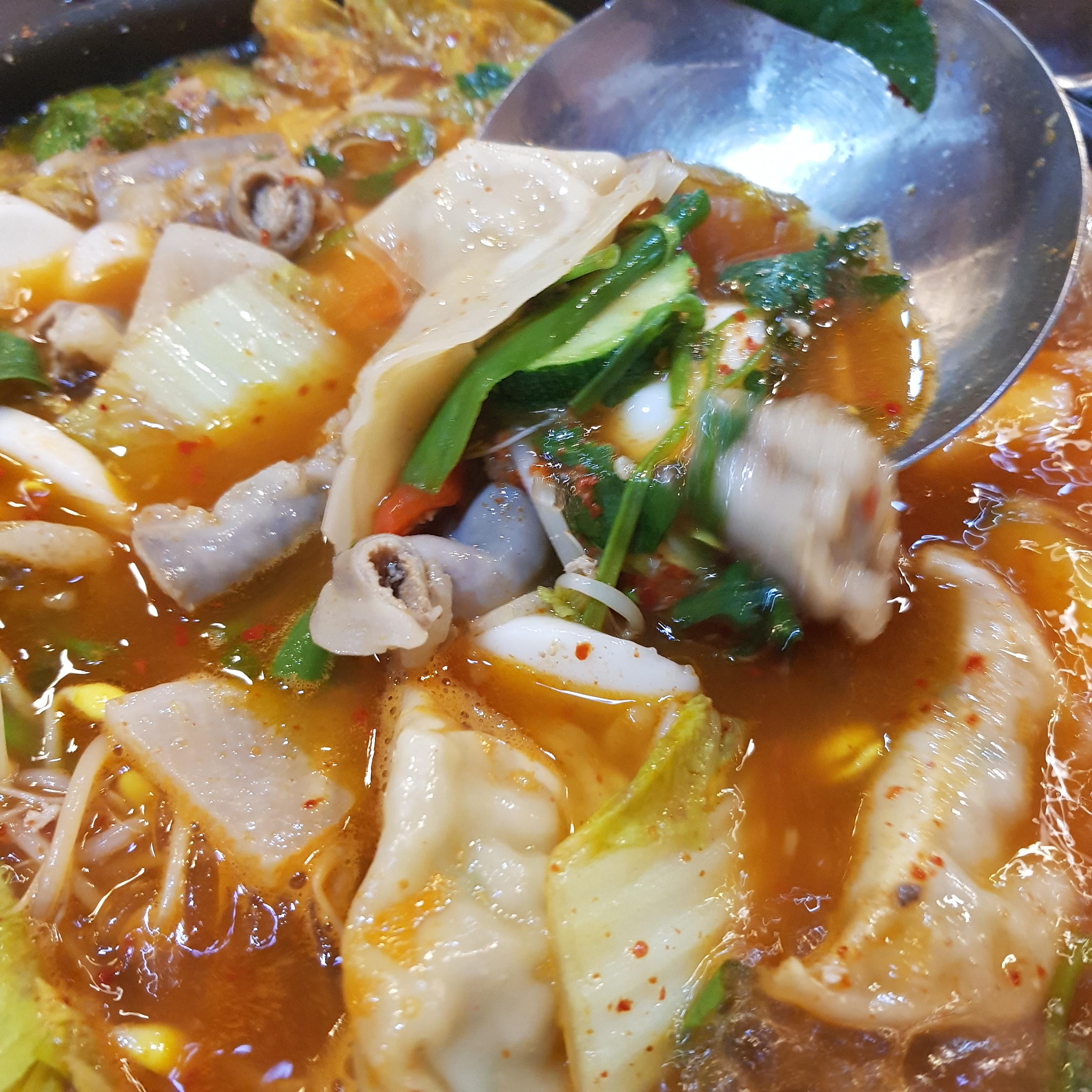 곱창전골 안에 곱창이랑 만두랑 당면 무 여러 가지가 들어가 있는데 정말 맛있습니다.
