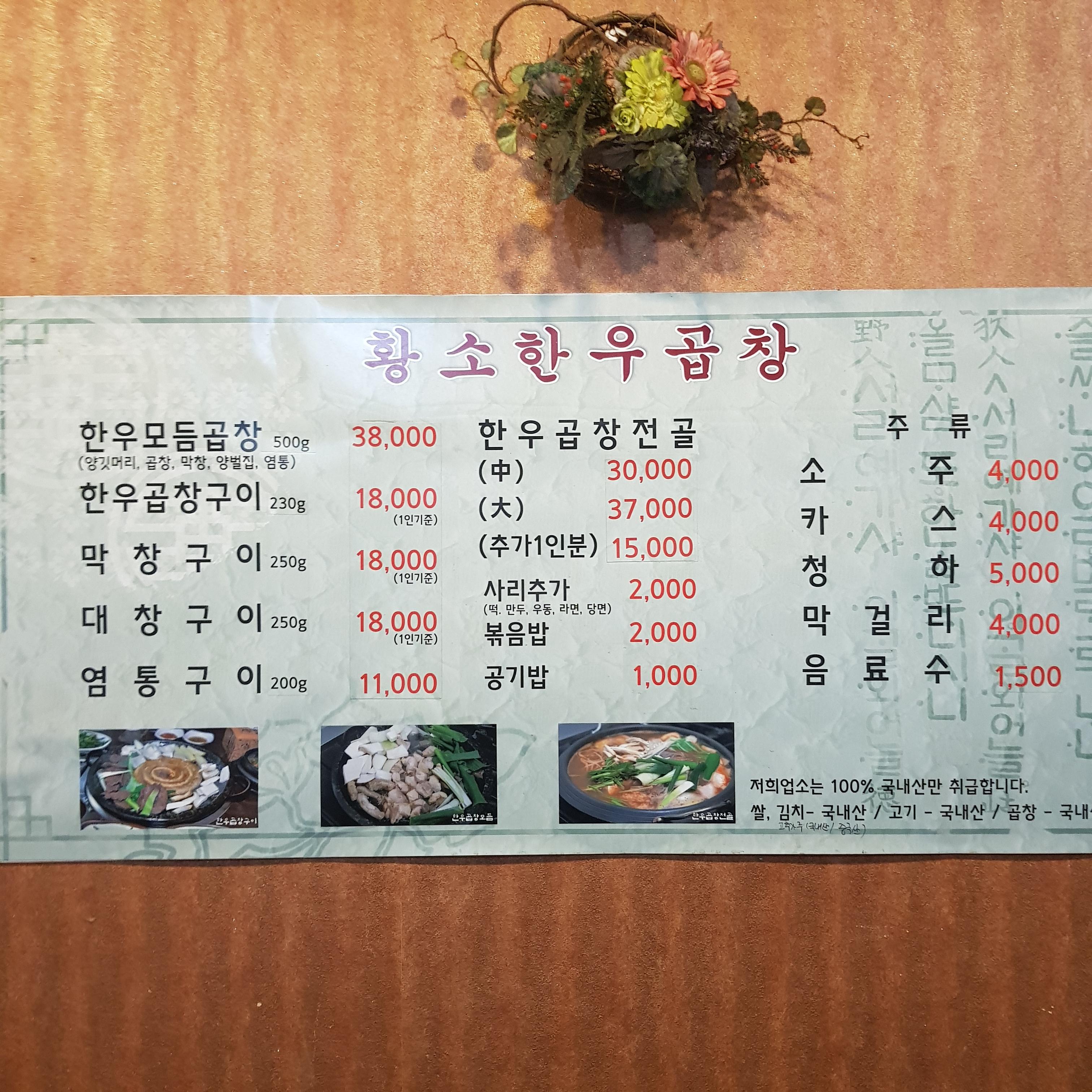 황소 한우곱창집 메뉴판입니다. 한우 모둠 곱창이 제일 잘 나가는 메뉴이고요 그다음으로는 사람들이 곱창전골을 많이 시켜서 먹습니다.