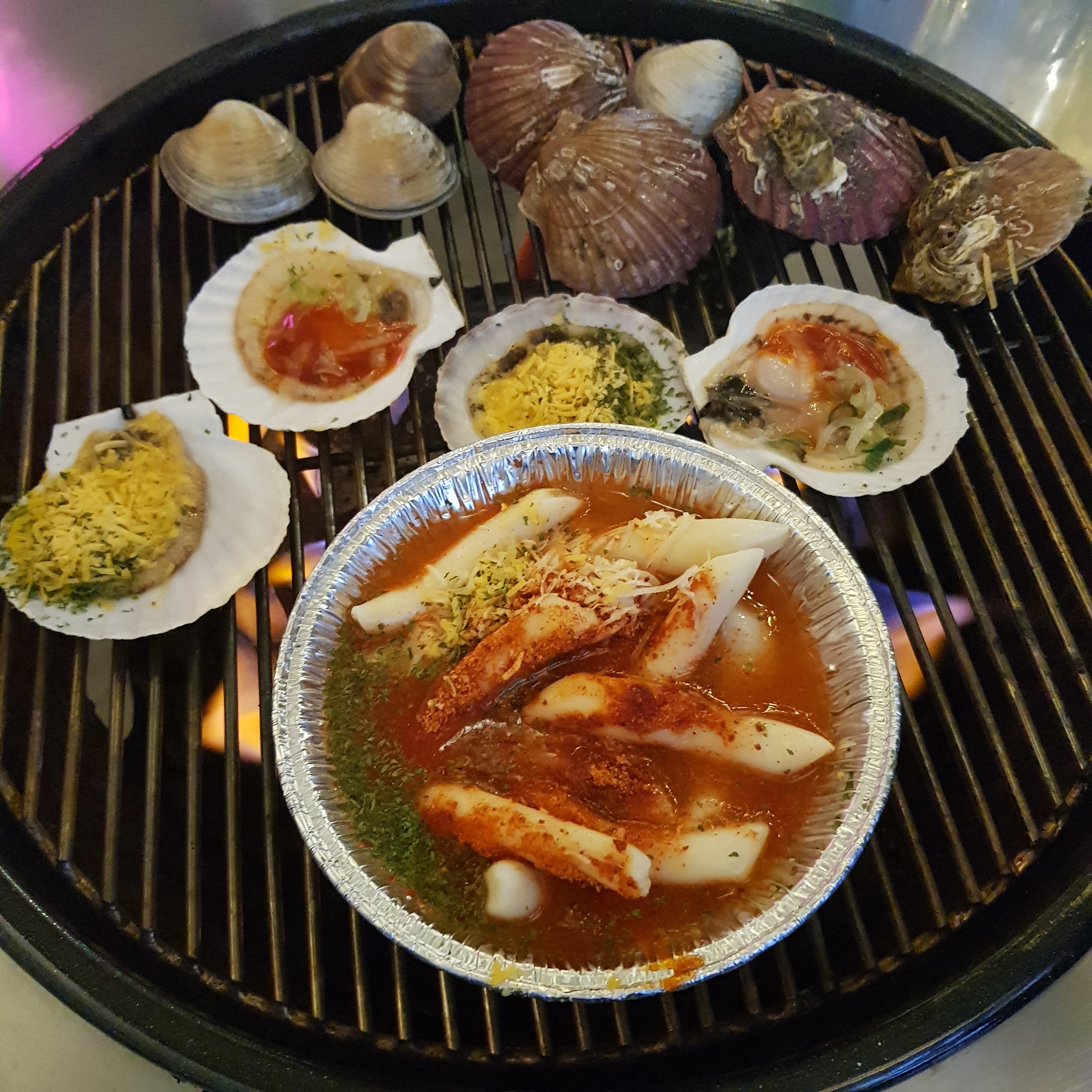 첫 번째 조개구이가 나왔습니다. 떡볶이랑 각종 조개가 먼저 나왔어요.