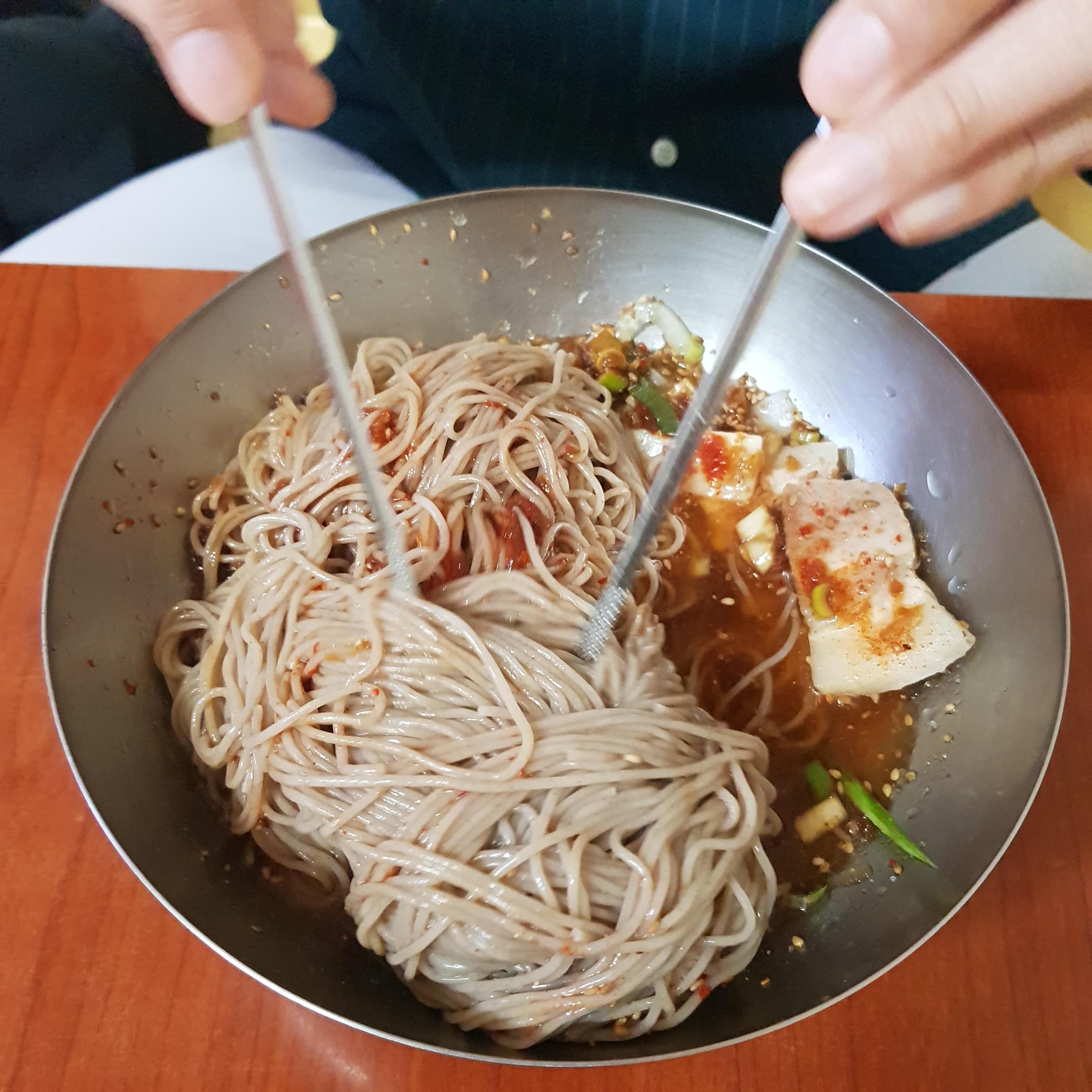 여기는 물 비빔 이렇게 정해지는 것은 없고요. 비빔으로 나와요 물막국수를 드신고 싶으신 분들은 육수를 부어서 먹으면 됩니다.