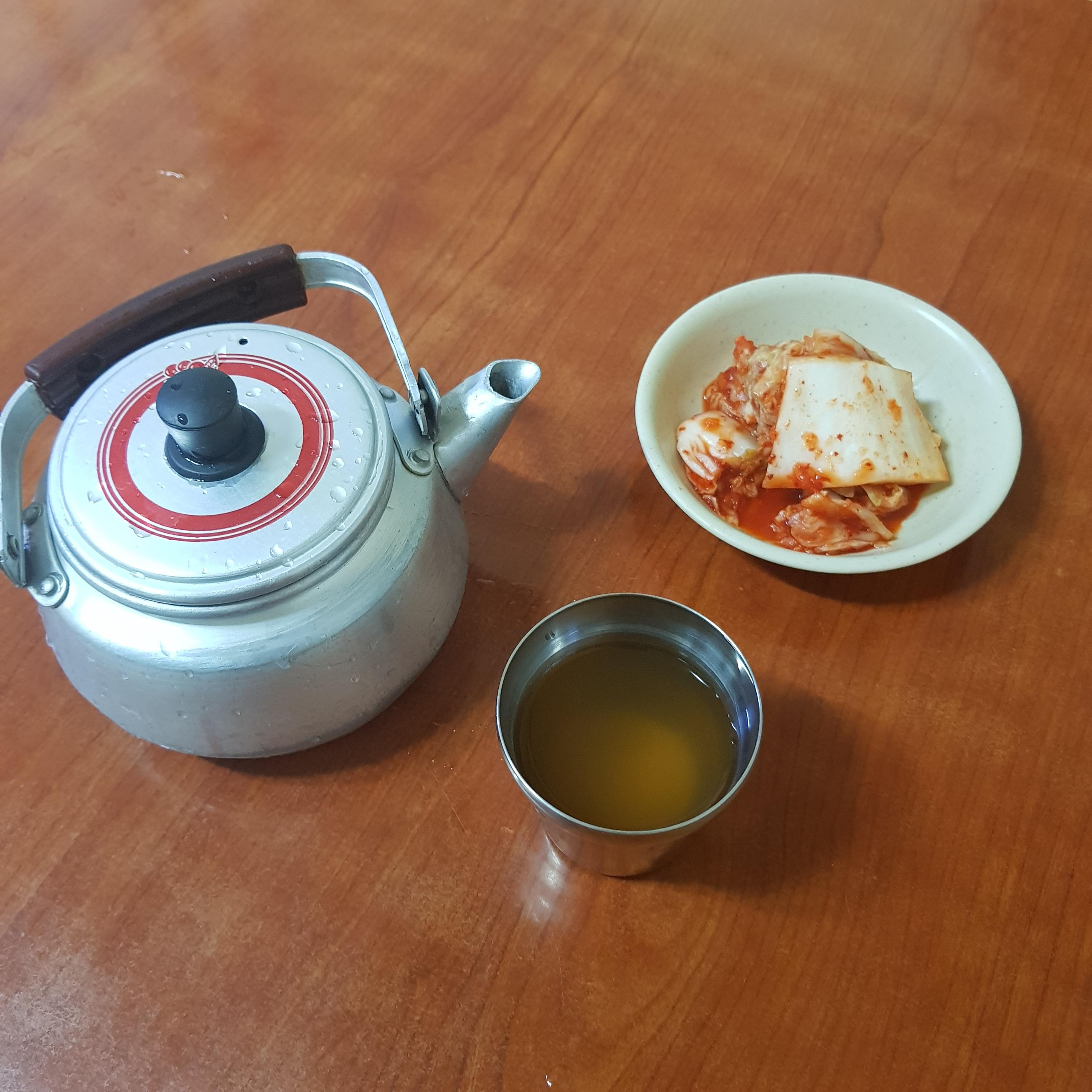 기본 반찬 세팅입니다. 김치랑 육수 두 가지만 나와요 육수는 뜨거운 게 아니도 차가운 육수예요