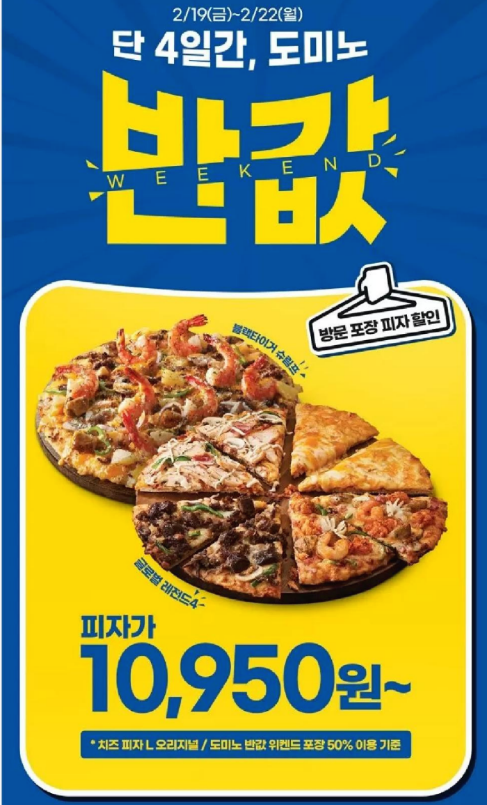 도미노피자가 방문 포장 피자를 50% 할인해 주는 이벤트를 진행한다. 19일 도미노피자는 공식 홈페이지를 통해 도미노 반값 위켄드' 이 벤트를 시작한다고 밝혔다.