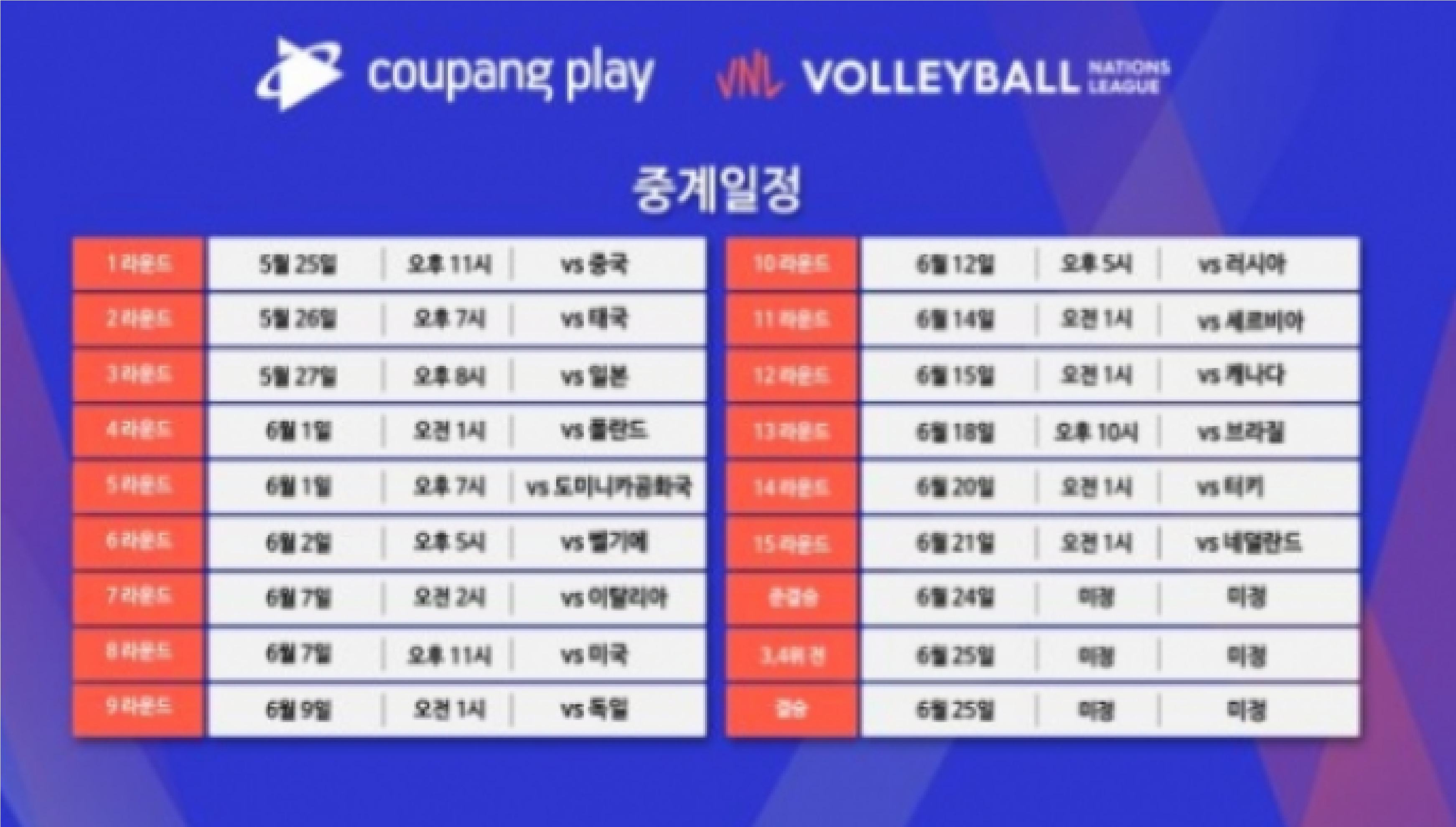 대 만민 국 여자 배구팀 일정표입니다.