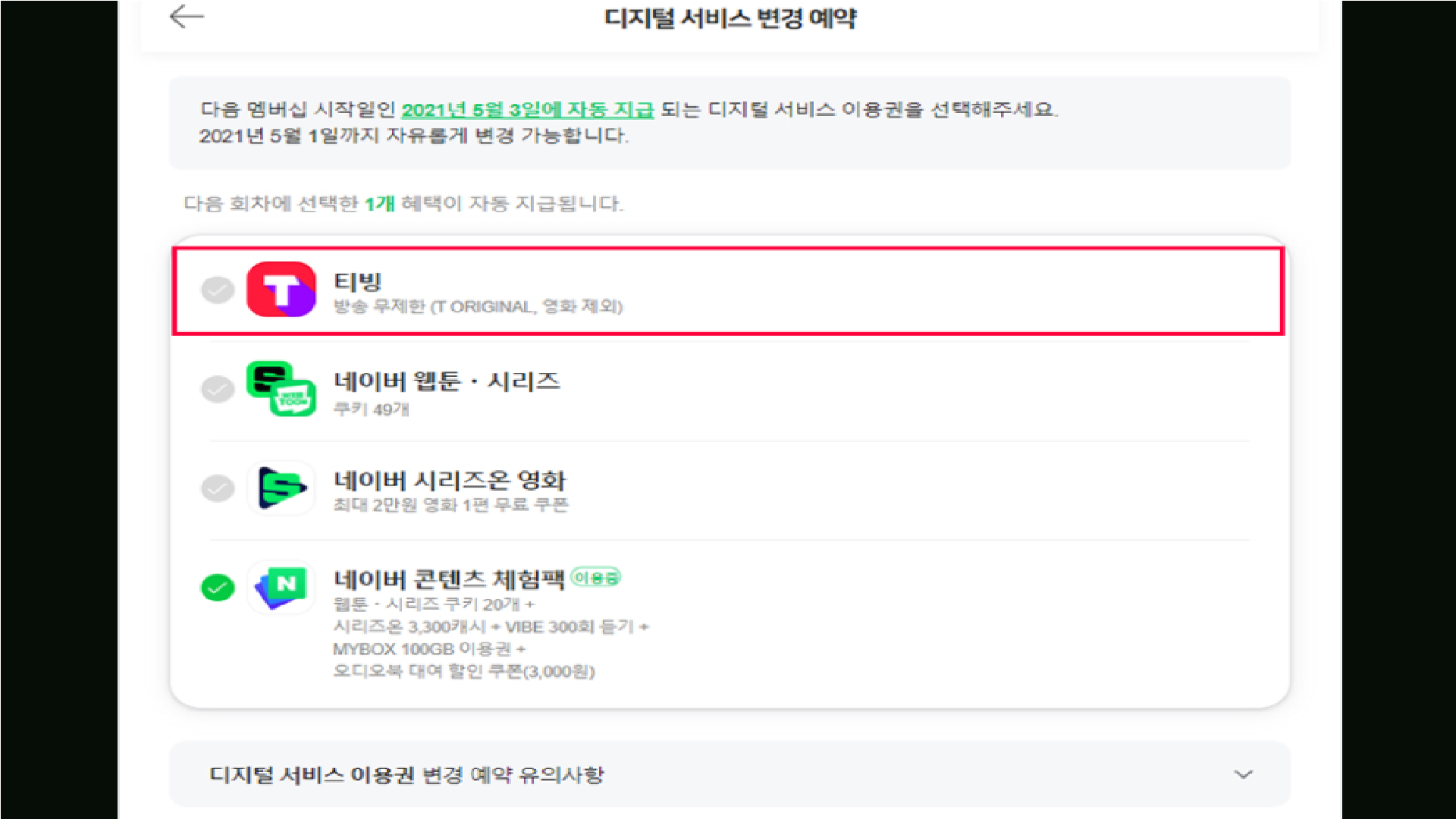 네이버 플러스 멤버십 가입을 하고 난 이후에 디지털 서비스 변경 페이지에서 티빙을 선택하여 무제한 방송을 보시면 될 것 같습니다. 지금 현재 유로 2020도 시청이 가능하고 지금 현재 가입을 한다면 한 달 무료 + 네이버 페이 5천 원 적립 혜택까지 있어서 아주 이득이라고 생각합니다.