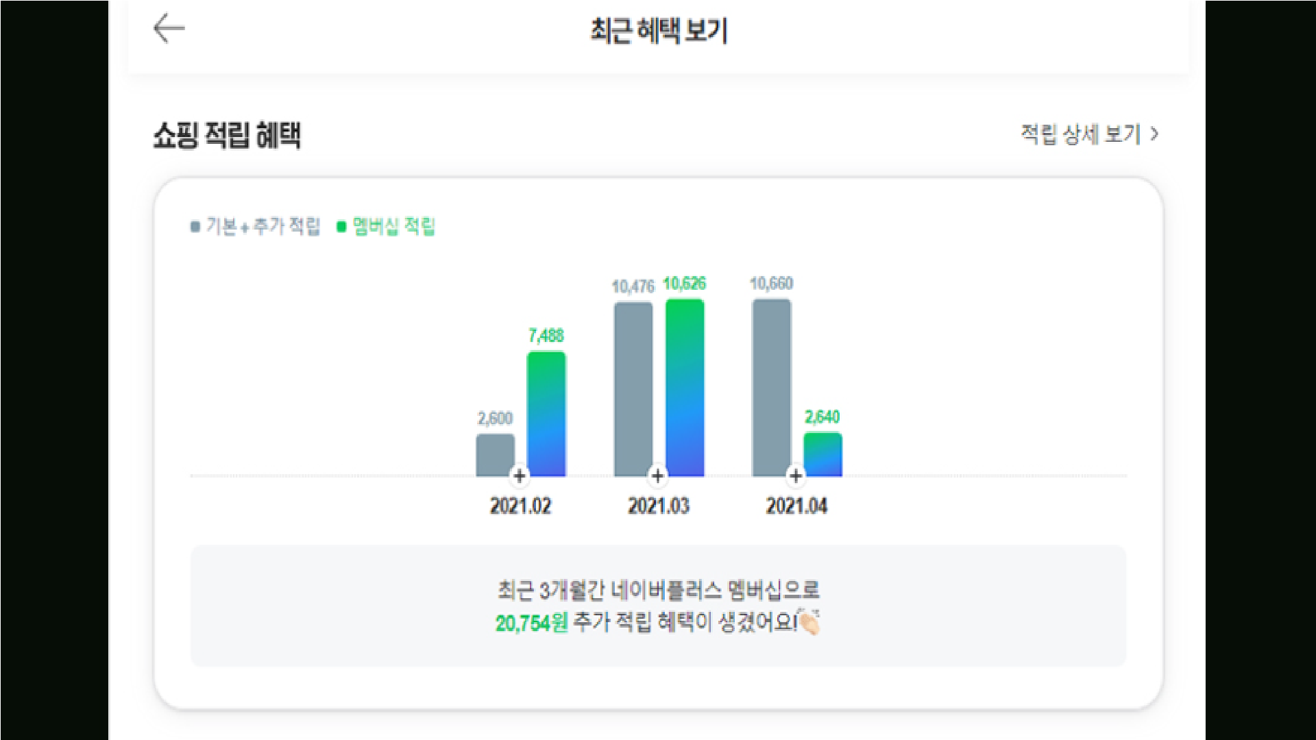 해당 멤버십은 월 4900원을 내고 이용한다고 하는데요. 혜택은 3개월간 총 20.754원의 추가 적립 혜택을 받았습니다. 이용료 3개월 이용료가 14,700원을 해도 적립된 혜택이 더 많은 셈이라고 합니다 이 경우는 네이버에서 일정 금액 쇼핑을 하는 경우에 유효한 것인데요. 그러나 꼭 물건을 구매하지 않더라도 충분한 이득이 있다고 합니다.