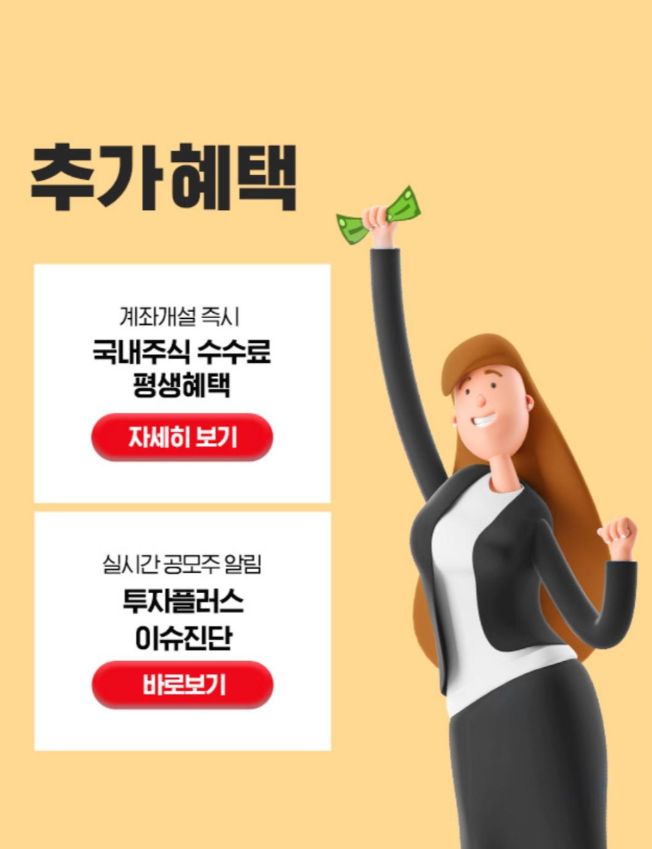 계좌 개설 죽시 국낸 주식 수수료 평생 혜택!!!!!!!! 그러고 실시간 공모주 알림이랑 투자플러스 이슈 진단을 해주고 있습니다.