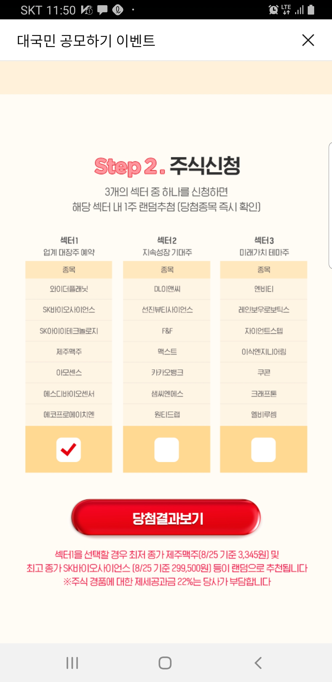 내가 받고 싶은 주식 선택하고 당첨 결과 보기