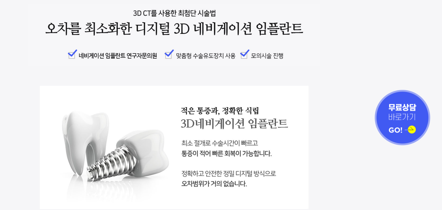 우선 장점으로 말하자면 과도한 발치가 없는 자연치아 최우선 시술이 가능하고 정확한 임플란트 식립하고 정확하고 안전한 정밀 디테일한 방식으로 오차범위가 거의 없습니다. 그러고 통증 또한 적어서 많은 사람들 이용하여 점점 증가 가는 추세입니다. 최소 절개로 수슬 시간이 빠르고 통증이 적어 빠른 회복이 가능합니다.