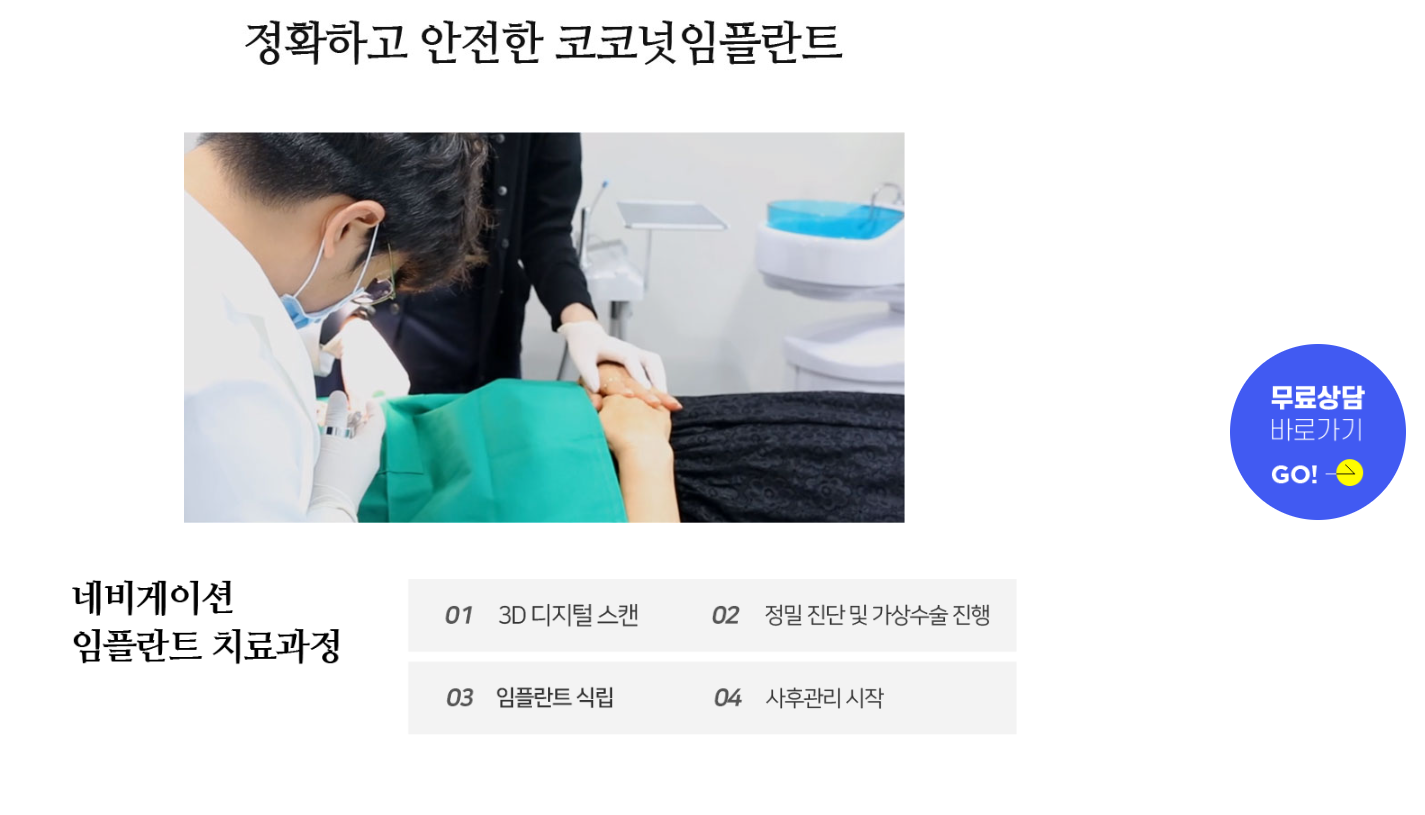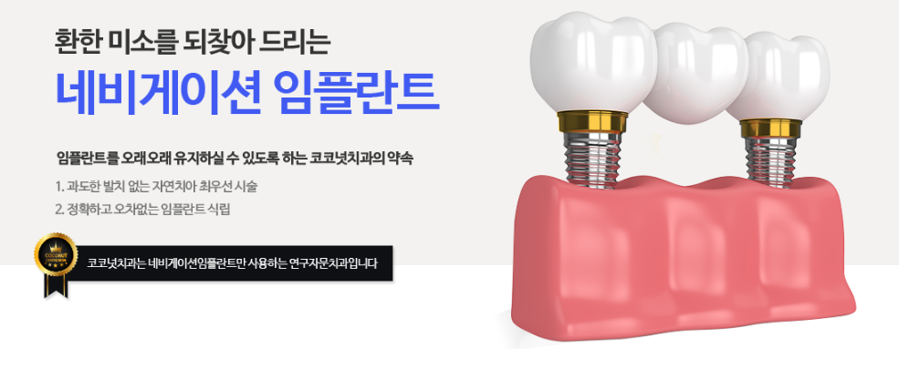 코코넷 치과의 내비게이션 임플란트는 내비게이션 3D 컴퓨터 모의 시술로 최적의 경로를 찾아 일반 임플란트보다 환자의 턱뼈에 자극을 주지 않고 임플란트 식립 부분만 작게 절개하는 시술방법입니다. 지금 상담을 하시면 최저가로 안내가 가능합니다.