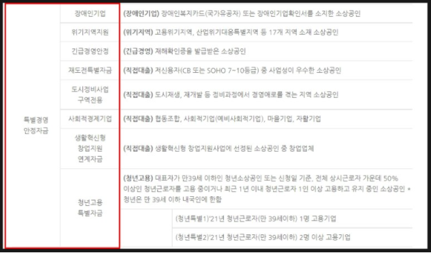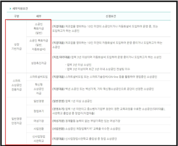 지금 현재 크게 성장기반, 스마트 소상공인 전용, 일반경영 자금 세 분류이며 그 외에 특별 금액이 있습니다. 첫 번째로는 성장 금액은 특화(일반, 자동화 설비), 성장촉진으로 나눠진다고 합니다. 스마트 상공인 스마트 설비, 혁신형 자금으로 나눠진다고 합니다. 지금 현재 일반경영 안정 금액은 일반경영, 창업 초기, 여성가장, 사업전환, 신사업 창 사관학교로 5개로 이뤄진다고 합니다. 이 외에도 특별경영 금액이 총 8종 있습니다. 장애인, 위기 지역, 긴급경영, 재도전 특별, 도시정비사업구역 전용, 사회적 경제기업, 생활혁 신형 창업지원 연계, 청년고용 특별고용 금액 등이 있습니다.