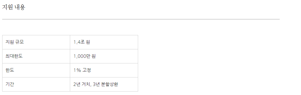 지금 현재 특별한 결격사유가 없다면 대상자가 신청을 한다면 대부분 지원을 받을 수 있습니다. 최대한도는 1,000만 원이며 1% 고정 금리로 5년간 자금을 사용할 수 있습니다. 최대 1,000만 원 1% 고정 1,4조 원 규모 자금 소진 시 종료가 된다고 합니다.