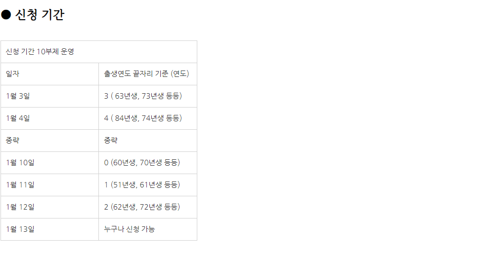 지금 현재 1월 3일부터 출생연도 끝자리 기준 10부제를 운영하여 신청을 받는다고 합니다. 온라인을 통해서 접수를 하는 만큼, 공휴일, 주말에 관계없이 모든 일자에 신청이 가능합니다. 10부제 신청 후 1월 13일부터는 출생연도에 관계없이 접수를 할 예정이라고 합니다. 100% 비대면 신청 출생 연도 끝자리 기준, 10부제 시행이 핵심입니다.