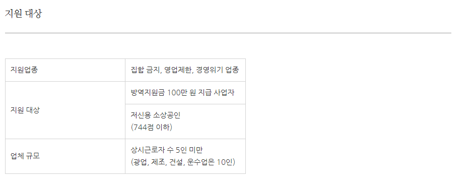 집합 금지, 영업제한, 경영위기 업종이 그 대상자이나 이번 신청은 방역지원금 100만 원 지급 사업자를 대상으로 시행을 한다고 합니다. 방역지원금 100만 원을 받았으며, 저신용 소상공인이라면 신청이 가능합니다. 핵심은 이번 지원금 방역지원금 100만 원 지급받은 저신용 소상공인입니다.