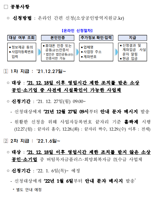 1차 지급 같은 경우에는 21년 12월 27일부터 신청이 되고 대상은 21년 12월 18일 이후 영업시간 제한 조치를 받은 소상공인 소기업 중 사전에 시설 확인이 가능합 사업체입니다. 대상은 21년 12월 18일 이후 영업시간 제한 조치를 받은 소상공인 소기업 중 사전에 시설 확인이 가능한 사업체이고 신청 기간은 21년 12월 27일 월요일 아침 9시부터라고 합니다. 신청대상에게 21년 12월 27일 09시부터 안내 문자 메시지를 발송하고 원활한 신청을 위해서는 홀짝제를 도입한다고 합니다. 자세한 사항은 사진을 참조해주시면 감사하겠습니다.