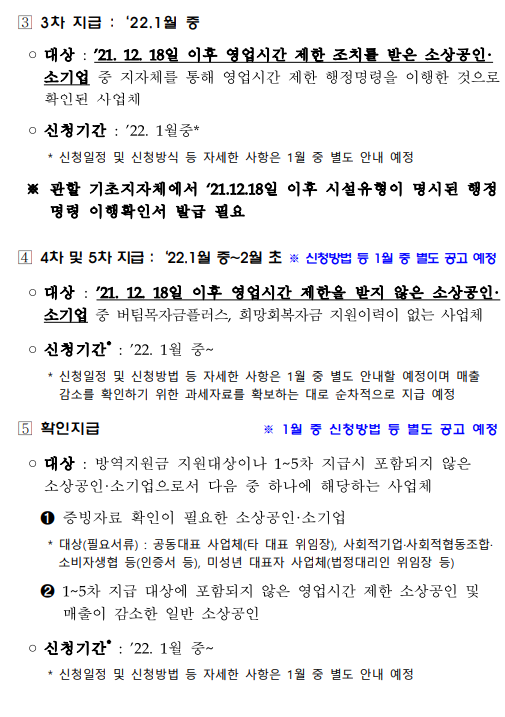매출이 감소하거나 감소가 예상되는 소상공인 소기업을 대상으로 하고 다수 사업체의 경우 공고문 내 별도 기준을 확인하시면 됩니다. 사업체 당 100만 원 정액 지급을 한다고 합니다. 지원기준 21년 12월 18일 이후 중대본의 영업시간 제한 조치를 받은 소상공인 소기업을 지원한다고 합니다. 영업시간 제한에 따라 심각한 피해가 예쌍 되므로 매출 감소로 간주하여 지원을 시행한다고 합니다. 21년 12월 18일 이후 영업시간 제한을 받지 않았으나 매출이 감소한 것으로 인정되는 소상공인 소기업으로서 다음 중 하나에 해당되는 사업체가 해당이 된다고 합니다. 버팀목 자금 플러스 또는 희망회복 자금을 지급받은 사업체나 버팀목 자금 플러스 또는 희망회복 자금을 지급받은 사업체에 지급을 한다고 합니다.