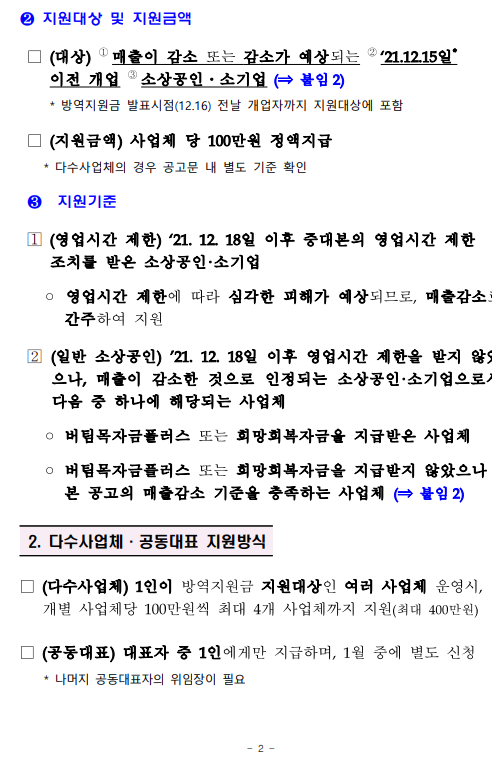 방역지원금 1인 경영 다수 사업체 공동 대표 지원 방식