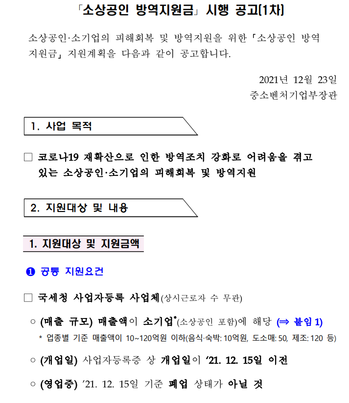 소상공인 소기업의 피해회복 및 방역지원을 위한 소상공인 방역 지원금 지원계획을 다음과 같이 말한다고 합니다. 사업에 목적은 코로나 19로 인하여 재확산으로 인한 방역조치 강화로 어려움을 겪고 있는 소상공인 소기업의 피해 회복을 위해서 방역지원을 한다고 합니다.