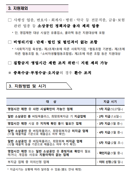 아무래도 사행성 업종에 있는 변호사, 회계사, 병원, 약국 등 전문직종, 금융 보험 관련 업종 등 소상공인 정책자금 융자 제외 업종이 되겠습니다. 여기서 예외적으로 대상 시설인 유흥업소, 콜라텍 등은 지원대상에 포함이 된다고 합니다. 또 비영리 단체 법인 및 법인격이 없는 조합이 해당이 되며 집합 금지 영어시간제한 조치 위반 시 지원 제외한다고 합니다. 또 여기서 중요한 사항이 중복수급과 부정수급 오지급의 경우 환수 조치를 한다고 합니다.