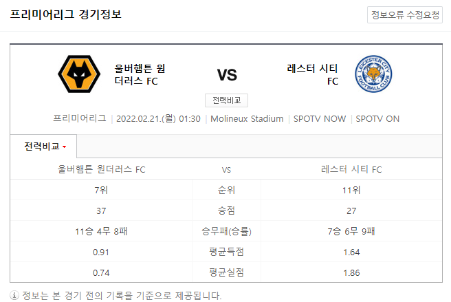 2/21 EPL 울버햄튼 vs 레스터 시티 경기 일정