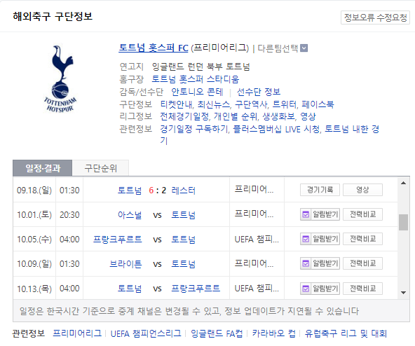 10/6 토트넘 아스널 손흥민 해외축구 무료 중계