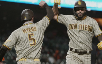 16일(한국시간) 열린 MLB 내셔널리그 디비전 시리즈의 샌디에이고와 LA 다저스의 경기가 열렸다. 샌디에이고는 이날 다저스에 5-3으로 역전승을 거두며 시리즈 전적 3승 1패로 리그 챔피언십에 진출했다. 이날 경기가 끝나자 샌디에이고 선수들이 기뻐하고 있다. 샌디에이고는 정규리그에서 다저스에 상대 전적에서 5승 14패로 밀렸지만 가을야구에서는 달랐다. 샌디에이고는 19일부터 필라델피아 필리스와의 내셔널리그 챔피언십시리즈 일정에 들어간다. 리그 챔피언십은 7전 4승 제로, 1, 2차전은 펫코파크에서 열린다. 해당 시리즈에서 승리를 거둔 팀이 월드시리즈에 진출한다. 대출샌디에이고는 이날 승리로 1998년 이후 24년 만에 내셔널리그 챔피언십시리즈에 올랐다.