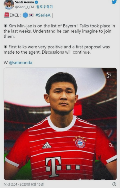 독일 바이에른 뮌헨이 괴물 김민재(27)를 영입해 초호화 센터백라인을 구축하게 됐다. 영국 축구전문매체 90MIN은 9일(한국 시간) 뮌헨이 김민재 영입을 위한 바이아웃 전액을 지불했다. 다음 주 초까지는 계약이 완료될 것으로 예상한다고 전했다. 독일 키커도 김민재가 세리에A 챔피언 나폴리에서 뮌헨으로 이적한다. 대출 조만간 뮌헨이 공식 발표할 것이라고 예상했다. 대출 스카이스포츠 독일판에 따르면 김민재는 뮌헨과 계약기간 2028년까지 5년간의 장기계약을 맺는다. 연봉은 1200만유로(약 170억원)를 받을 예정이다. 김민재의 바이아웃은 5000만유로(약 715억원)로 알려졌다.