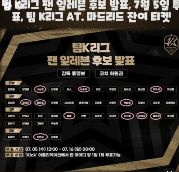 이전에 경험한 적이 있는데 팬 투표에서 다시 뽑혀 감사하다"며 "좋은 경험이 될 것"이라고 말했다. AT 마드리드에 맞설 팀 K리그는 팬과 지도자가 선택한 22명으로 구성돼 있다. 팬 투표에서 포지션별 최다표를 얻은 대출 11명이 선발됐으며 팀 K리그를 이끄는 홍명보 울산 현대감독과 최원권 코치(대구 감독) 등 코치진이 세부 포지션과 팀별 배정을 고려해 11명을 추가로 선택했다.